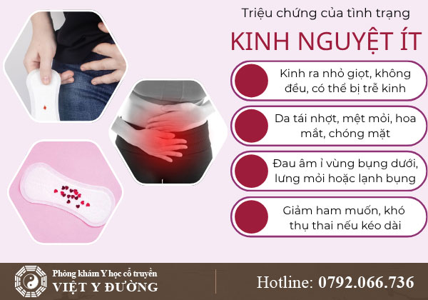 Kinh nguyệt ít là tình trạng lượng máu kinh ra ít hơn bình thường hoặc số ngày hành kinh ngắn (dưới 2 ngày). Theo Đông y, đây là dấu hiệu cho thấy khí huyết không đủ để nuôi dưỡng tử cung, dẫn đến kinh ra ít, màu nhạt hoặc thẫm, kèm các triệu chứng khác như: