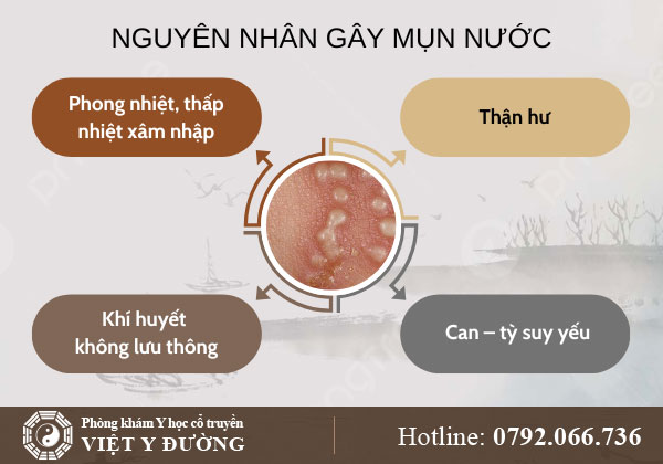 Mụn nước là tình trạng da nổi các bóng nước nhỏ, bên trong chứa dịch, có thể mọc rải rác hoặc thành cụm, thường kèm theo ngứa ngáy, nóng rát và khó chịu. Theo Đông y, mụn nước xuất hiện khi cơ thể bị rối loạn khí huyết, tạng phủ mất cân bằng, cộng thêm yếu tố phong – thấp – nhiệt xâm nhập.